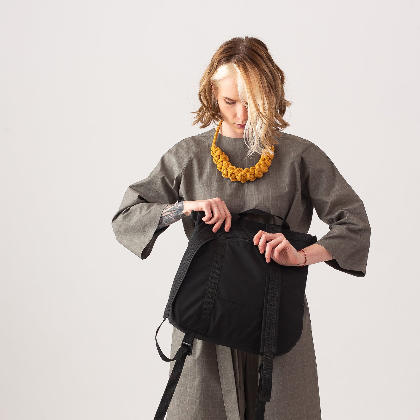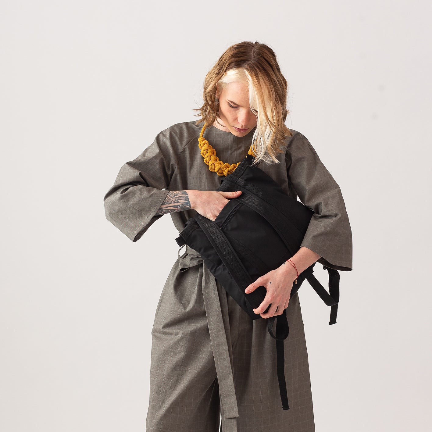 • Inside: 1 zippered + 1 open pocket (15 × 22 cm)