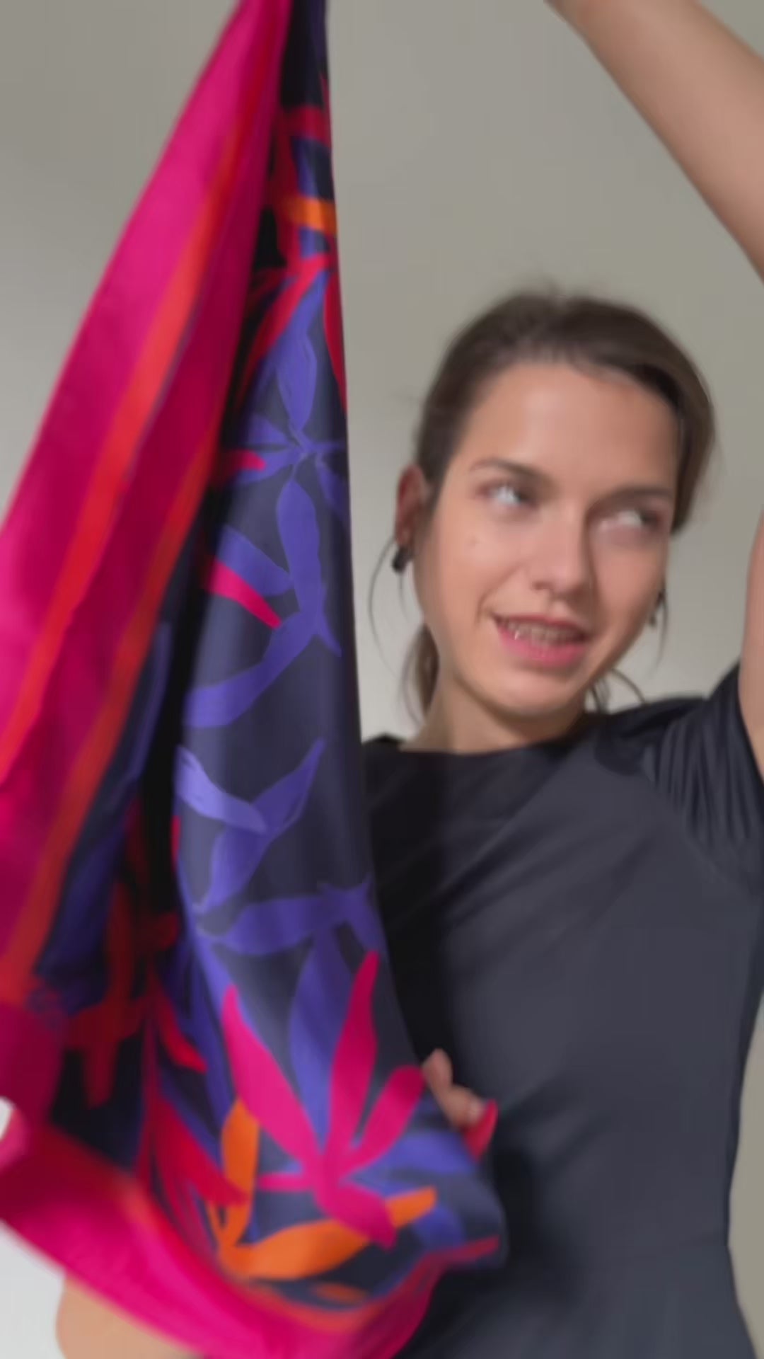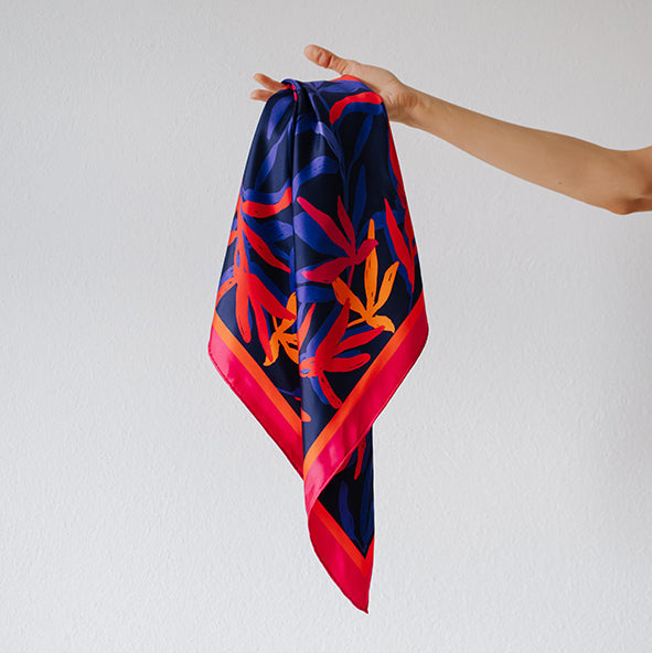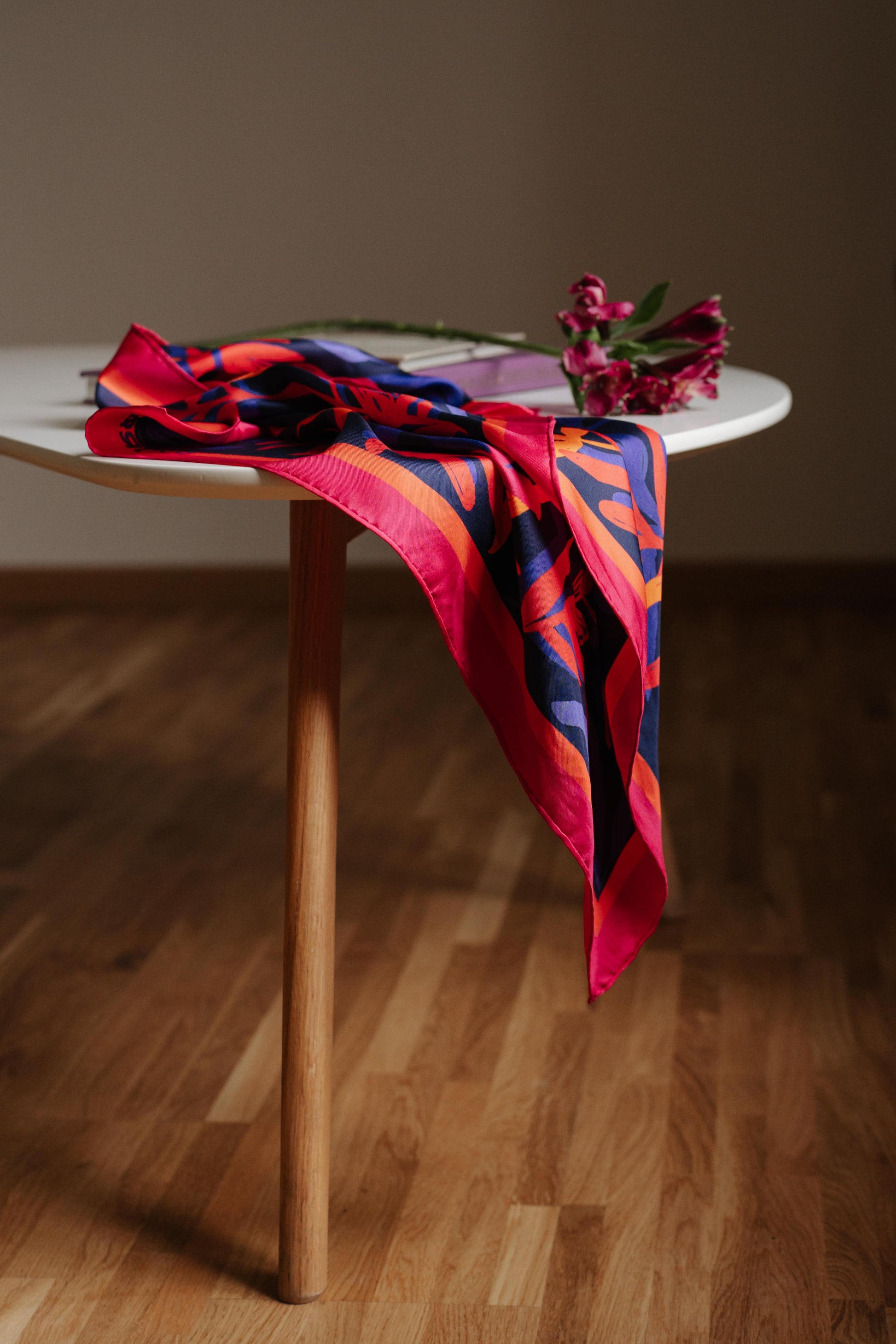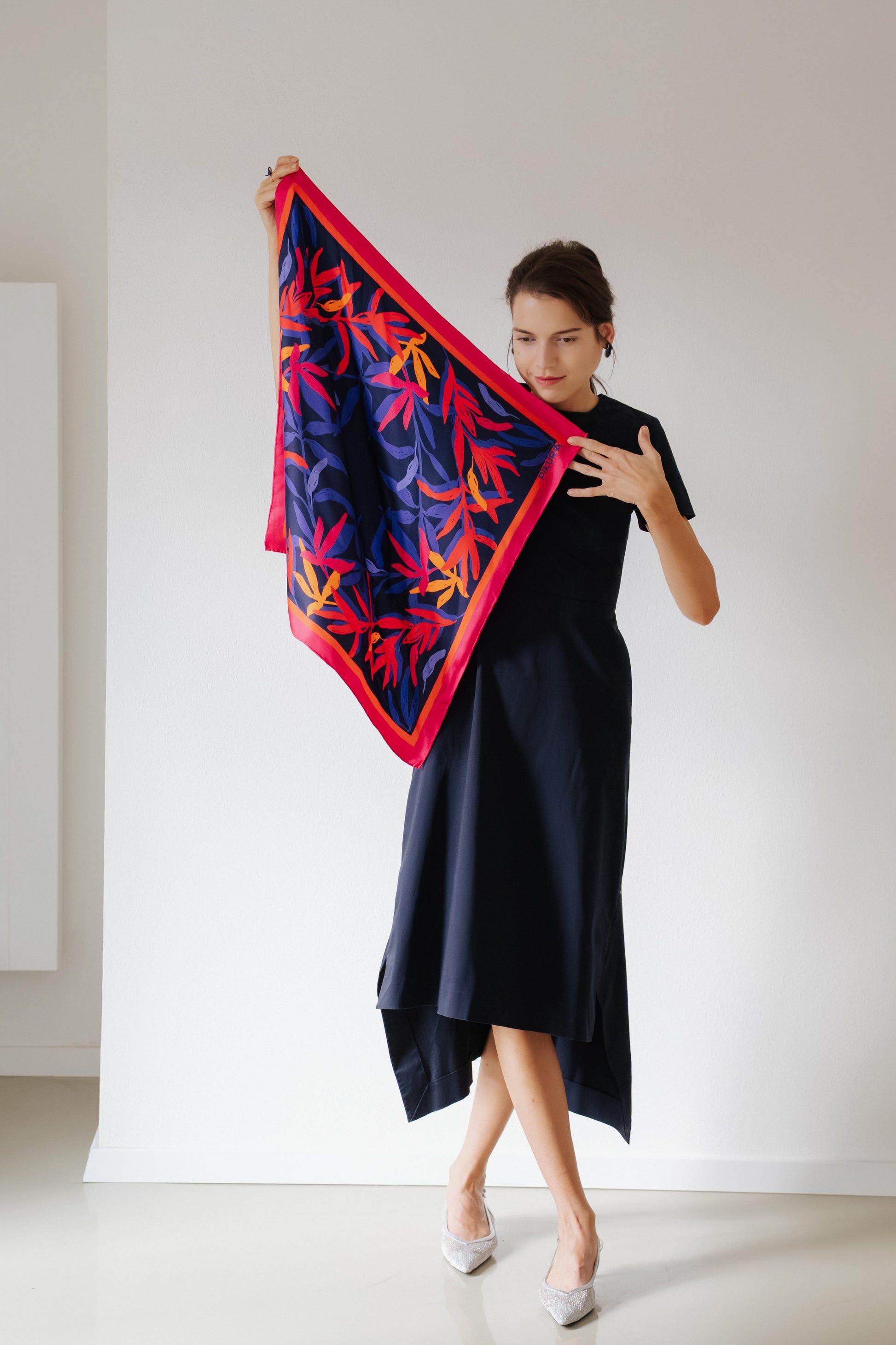 A 65×65 cm-es méretnek köszönhetően sokoldalúan viselhető: fejkendőként, nyakban, csuklón vagy akár táskára kötve. Egy időtlen, karakteres kiegészítő, amely bármely öltözéket különlegessé tesz.