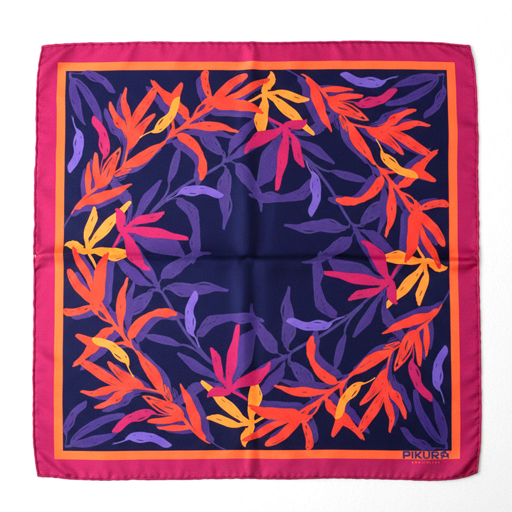 Ez az élénk mintázatú, prémium minőségű selyemkendő finom, puha tapintású 160 g Silk Twill anyagból készült, amely elegáns fényt és tartást ad a kendőnek. A szélei gondosan kézzel szegettek, ami kifinomult, luxus érzetet és hosszú élettartamot biztosít.
