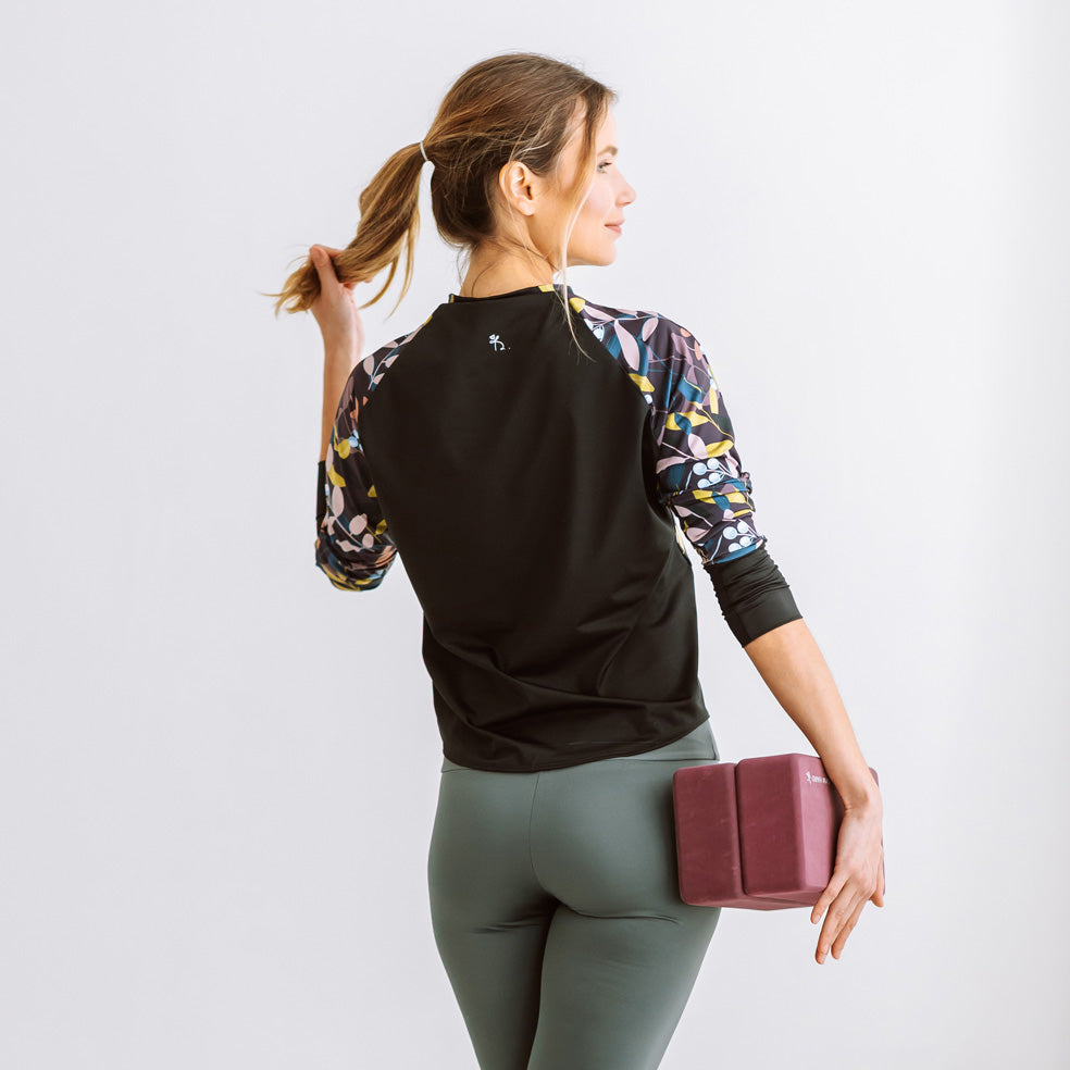 Ez a hosszú ujjú fitnesz felső laza szabásával és könnyű anyagával kényelmes viseletet nyújt, miközben optikailag karcsúsítja a derekat. Ideális választás jóga, pilates vagy szabadtéri sportok során, különösen hűvösebb időben. Szabad mozgást biztosít, miközben elegánsan követi a test vonalát.