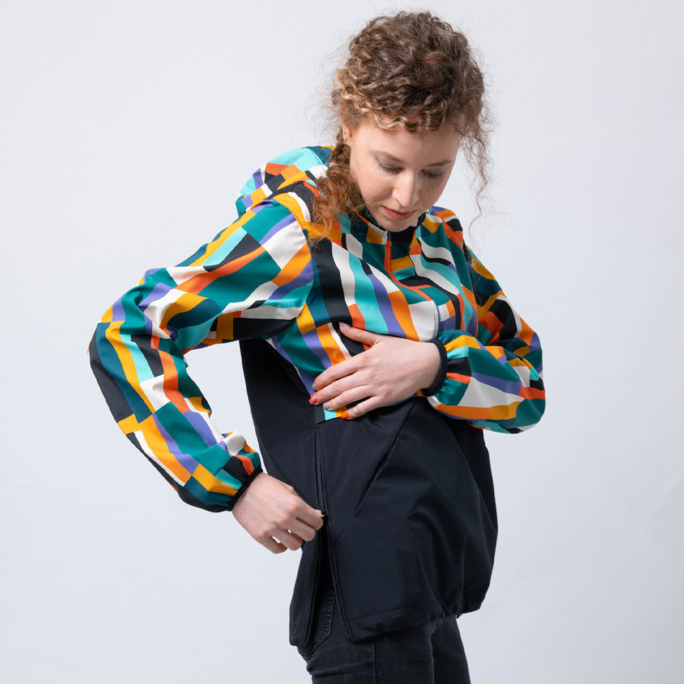 A csípőnél lévő rugalmas húzózsinórok célja, hogy mozgás közben is megvédjenek a széltől.